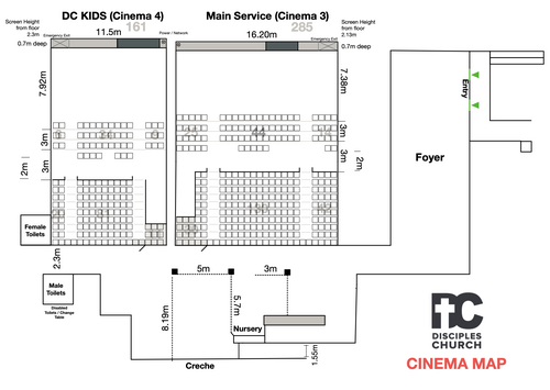 DC Kids get their own cinema space which they move to just before the sermon time. They have "Screen Time" at the start of DC Kids in Cinema 4 and then they move into "Table Time" where they get to work on their age specific lessons. We follow all our usual ChildSafe risk management practices.