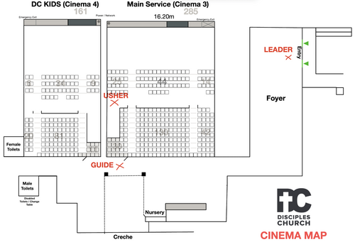 - Guide the congregation from Cinema 3 (Main Service) into Cinema 4 (for DC KIDS). Reminding them to go to the bathroom if needed.