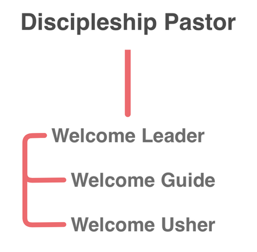 The Welcome Team reports to the Discipleship Pastor (Pastor Sly), and contains 3 team members per service.